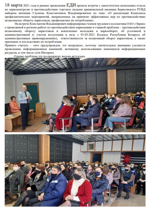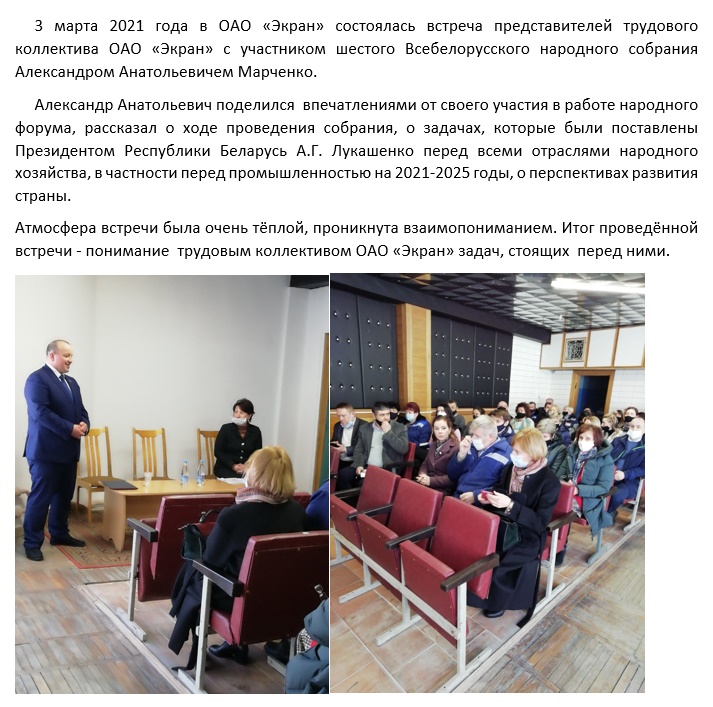 На торжественном мероприятии, посвящённом подведению итогов социально-экономического развития Борисовского района за 2020 год, которое состоялось 26 марта во Дворце культуры им. Горького, лучшими в промышленности в номинации «Лучший по профессии» названы и наши работники: -Волосач Елена Григорьевна- оператор станков с ЧПУ 6 разряда ц.№1; - Морозов Александр Васильевич – слесарь механосборочных работ 6 разряда ц.№19. Елена Григорьевна и Александр Васильевич –высококвалифицированные специалисты и наши лучшие работники, которыми гордится наш завод и наш город. За минутами волнения при вручении почётных наград – годы напряжённой работы и совершенствования в профессии. Уважаемые Елена Григорьевна и Александр Васильевич! Вы – наша гордость! Идеологическая работа в организации 2021год