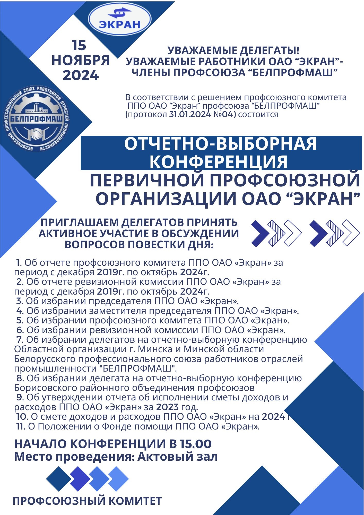 15 ноября 2024 г. прошла Отчетно-выборная конференция первичной профсоюзной организации ОАО «Экран».