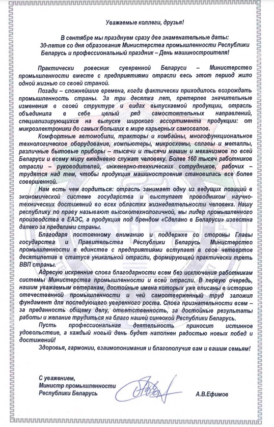 С уважением, Министр промышленности Республики Беларусь А.В.Ефимов |